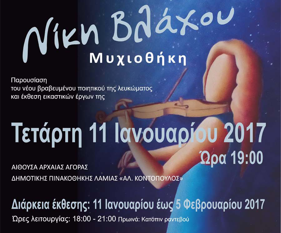 Ο Δήμος Λαμιέων μας προσκαλεί στην παρουσίαση του νέου βραβευμένου ποιητικού λευκώματος της Νίκης Βλάχου «Μυχιοθήκη» και στα εγκαίνια ομότιτλης έκθεσης εικαστικών έργων της ιδίας την Τετάρτη 11 Ιανουαρίου 2017 και ώρα 19:00 στην αίθουσα «Αρχαίας Αγοράς» της Δημοτικής Πινακοθήκης Λαμίας «Αλέκος Κοντόπουλος».