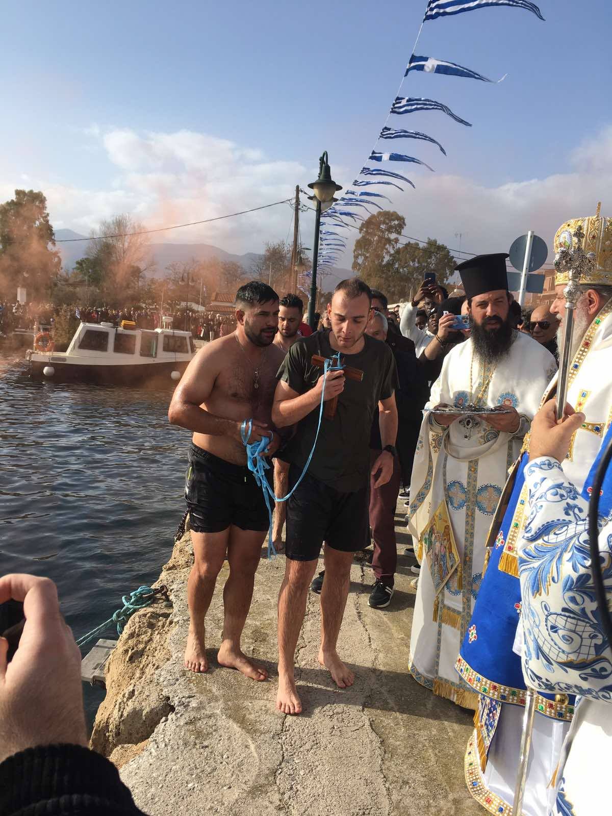 Οι θαρραλέοι κολυμβητές που βούτηξαν στα παγωμένα νερά των λιμένων της Σκάλας Αταλάντης και της Αρκίτσας για να πιάσουν τον τίμιο Σταυρό τιμήθηκαν από τους Αρχιερείς και τον Ιερό Κλήρο.