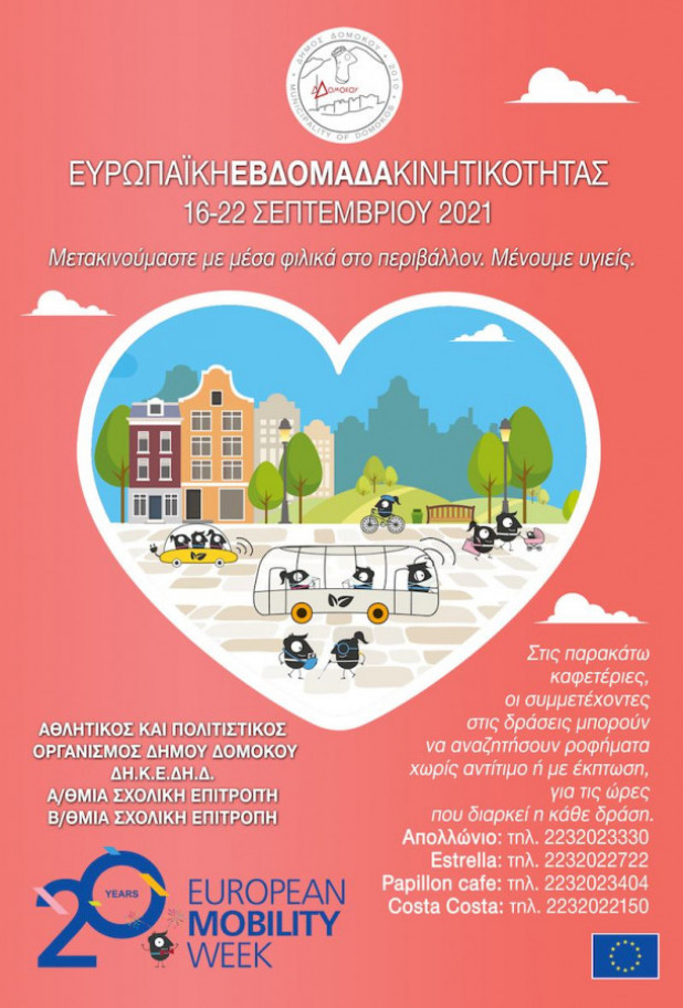 O Δήμος Δομοκού συμμετέχει, με τη διοργάνωση δράσεων, στην Ευρωπαϊκή Εβδομάδα Κινητικότητας, η οποία πραγματοποιείται κάθε χρόνο από τις 16-22 Σεπτεμβρίου. Η ΕΕΚ είναι ένας θεσμός που προάγει την βιώσιμη αστική κινητικότητα και το θέμα που επιλέχθηκε για το 2021 είναι «Είμαστε Υγιείς και Ασφαλείς με τη Βιώσιμη Κινητικότητα».