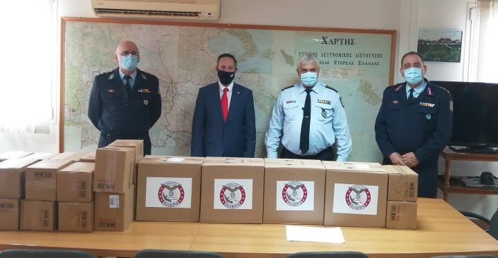 Η AHEPA «THERMOPYLES», τοπική επιτροπή για τη Λαμία και μέλος της οργάνωσης AHEPA HELLAS, στο πλαίσιο της προσπάθειας για τον περιορισμό της εξάπλωσης του ιού covid–19 και με γνώμονα την αναγνώριση του έργου που επιτελεί με υπευθυνότητα το αστυνομικό προσωπικό της Γενικής Περιφερειακής Αστυνομικής Διεύθυνσης Στερεάς Ελλάδας, προσέφερε χθες το πρωί 400 υφασμάτινες μάσκες προσώπου και 400 αντισηπτικά χεριών, εγκεκριμένα από τον Ε.Ο.Φ..