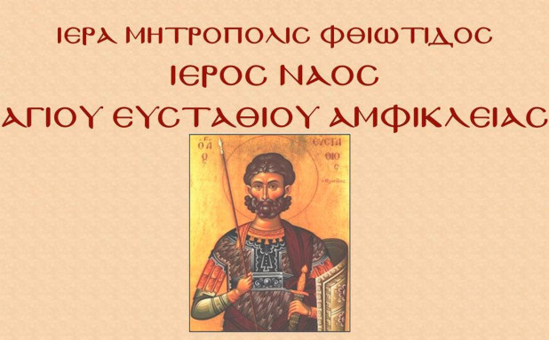 Τη μνήμη του Αγίου Ευσταθίου τιμά ο ομώνυμος Ενοριακός Ναός της Αμφίκλειας την Κυριακή 19 και τη Δευτέρα 20 Σεπτεμβρίου και οι θρησκευτικές εκδηλώσεις που θα υπάρξουν στο πλαίσιο των εορταστικών εκδηλώσεων, θα είναι οι ακόλουθες: