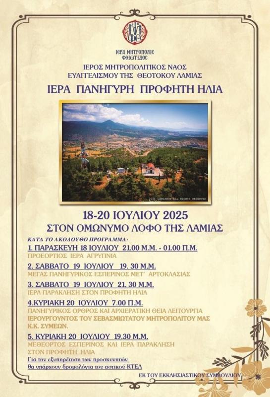 Τὸ Ἐκκλησιαστικὸ Συμβούλιο τοῦ Ἱεροῦ Μητροπολιτικοῦ Ναοῦ Εὐαγγελισμοῦ τῆς Θεοτόκου Λαμίας, σᾶς προσκαλεῖ νά τιμήσετε μέ τήν παρουσία σας τήν ἐτήσια Πανήγυρη τοῦ Ἐξωκκλησίου τοῦ Ἁγίου Προφήτου Ἠλιού τοῦ Θεσβίτου τῆς ἐνορίας μας στόν ὁμώνυμο λόφο τῆς Λαμίας, κατά τό ἀκόλουθο πρόγραμμα.