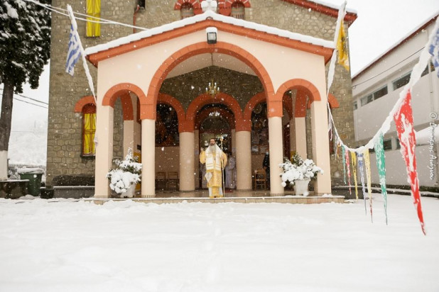 Ξεκινώντας νωρίς τα ξημερώματα από το χιονισμένο Επισκοπείο της Λαμίας ο κ. Συμεών κατάφερε να φτάσει στις 07:30 πμ στον Ιερό Ναό του Αγίου Γεωργίου, στο ομώνυμο χωριό του Αγίου Γεωργίου Τυμφρηστού του Δήμου Μακρακώμης.