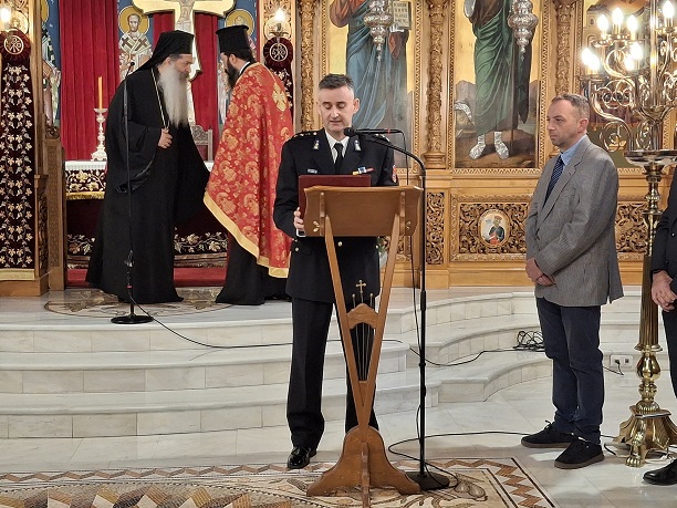 Ο Πύραρχος, Λάμπρος Καλοπήτας, ανέγνωσε την Ημερήσια Διαταγή του Αρχηγού του Πυροσβεστικού Σώματος, Αντιστράτηγου, Θεόδωρου Βάγια, η οποία ανάμεσα σε άλλα ανέφερε: «Σήμερα γιορτάζουμε τους Αγίους Τρεις Παίδες εν Καμίνω. Τους τρεις προστάτες μας, Αγίους Ανανία, Αζαρία και Μισαήλ, οι οποίοι με τη δύναμη της πίστης και την ακλόνητη αφοσίωσή τους στον Θεό, επέμειναν τη δοκιμασία της πυρωμένης καμίνου και έμειναν αβλαβείς. Το παράδειγμά τους, αποτελεί διαχρονικό σύμβολο θάρρους, πνευματικής αντοχής και υπεράσπισης των αξιών απέναντι σε κάθε επεισόδιο. Με αφορμή τη σημερινή εορτή, καλούμαστε να αναλογιστούμε ότι στις καθημερινές μας αποστολές, συχνά αντιμετωπίζουμε δυσκολίες, πιέσεις και κινδύνους. Όπως οι Τρεις Παίδες στάθηκαν όρθιοι μπροστά στην απειλή έτσι κι εμείς οφείλουμε να επιδεικνύουμε συναίσθηση καθήκοντος και προσήλωσης στην αποστολή μας. Με αφορμή τη σημερινή γιορτή εκφράζω την εκτίμηση και το σεβασμό μου σε καθένα και καθεμία από εσάς που υπηρετεί με αφοσίωση, επαγγελματισμό και αυταπάρνηση. Η καθημερινή σας παρουσία στο πεδίο, η ετοιμότητα, η ψυχραιμία, η αυτοθυσία που επιδεικνύετε, αποτελούν θεμέλιο για την προστασία της κοινωνίας και την ενίσχυση της εμπιστοσύνης των πολιτών».