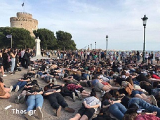 Πολύ κοντά στο Λευκό Πύργο, κοντά στο άγαλμα του Ναυάρχου Βότση ξάπλωσαν στο πλακόστρωτο της παραλίας, στη θέση του Φλόιντ που δολοφονήθηκε κατά τη διάρκεια σύλληψής του από αστυνομικούς.