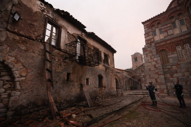 Η φωτιά τελικά στο πέρασμά της έκαψε ολοσχερώς τον περίβολο του προστατευόμενου μνημείου της UNESCO, έφτασε στο εσωτερικό του και κατέστρεψε ένα από τα παλαιότερα κτίρια του. Εκεί από την πρώτη στιγμή βρέθηκε και ο Μητροπολίτης Θηβών, Λεβαδείας και Αυλίδος Γεώργιος.