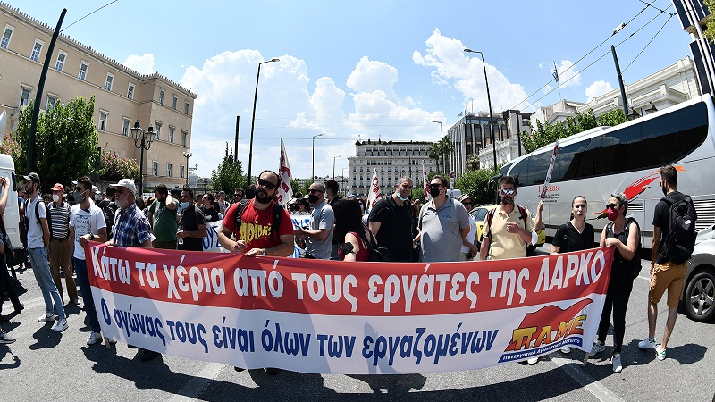 «Να μην περάσει το εγκληματικό νομοσχέδιο για τη ΛΑΡΚΟ» αναγράφει το πανό του Συνδικάτο Μετάλλου Φθιώτιδας.
