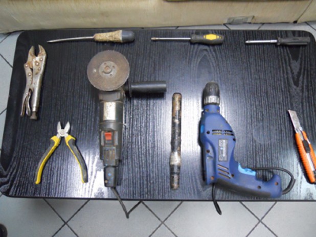 • πλήθος διαρρηκτικών εργαλείων (ηλεκτρικός τροχός κοπής μετάλλων, κρουστικό δράπανο, κόφτης μετάλλων, κατσαβίδια, φαλτσέτα κ.λ.π.), καθώς και